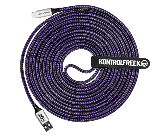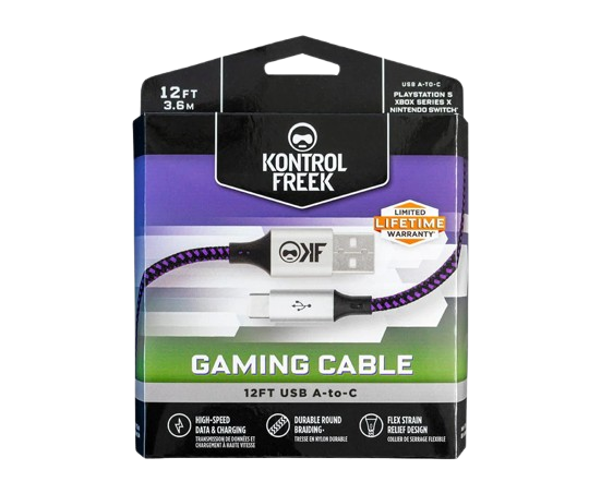 Our 12FT/3.6M USB Type-A to Type-C Gaming Cable™ was specifically designed to help gamers stay in charge of their Type-C compatible devices like PlayStation 5, Xbox Series X|S and Nintendo Switch. It supports USB 2.0 data transfer speeds up to 480Mbps and 2A charging. The stylish exterior features a durable black and purple nylon braid and a round construction to prevent tangling. The flex strain relief design reinforces stress points to increase the cable lifespan. It is compatible with all USB A-C devices. As an added bonus, it’s backed by KontrolFreek’s Lifetime Limited Warranty. Our warranty covers any defects in materials or workmanship under normal use conditions, for as long as you own the cable.
