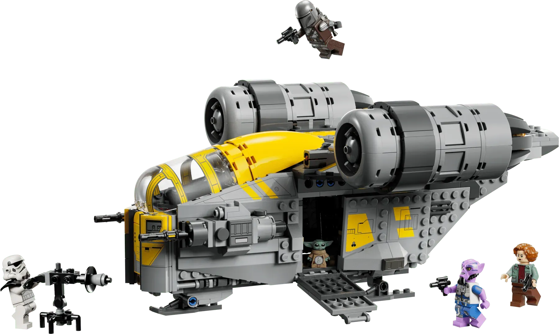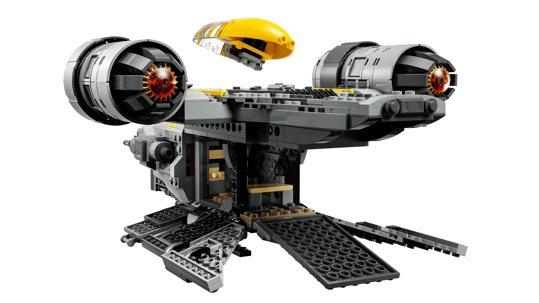 - THE RAZOR CREST – Place 2 LEGO® minifigures and Grogu in the cockpit, open the side panels for access to the engine and cargo compartment, fold down the landing ramps and activate the 2 stud shooters