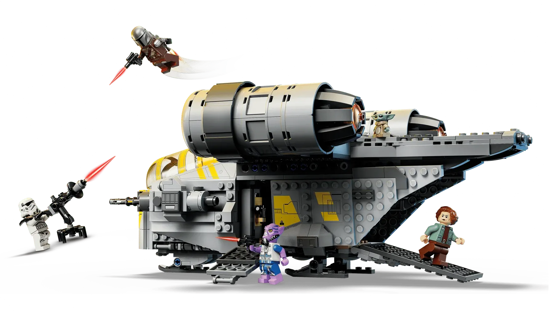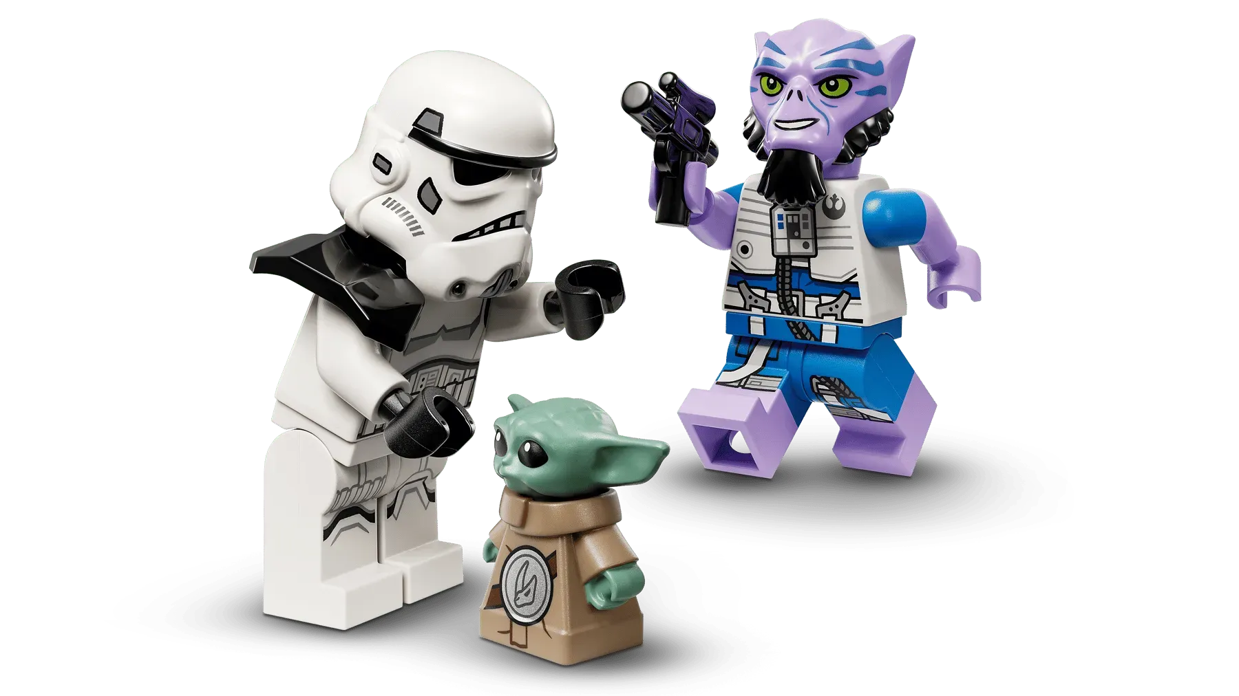 - 5 LEGO® STAR WARS™ CHARACTERS – The Mandalorian, with a blaster pistol and jetpack, an Imperial Remnant Stormtrooper with a blaster, Colonel Ward, Zeb Orrelios, and a Grogu LEGO figure